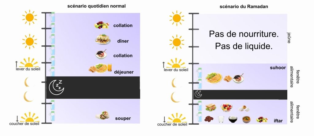 La durée du jeûne varie selon la localisation géographique et la période de l’année, allant d’environ 10 à plus de 21 heures. Les repas comprennent le suhoor (avant l’aube) et l’iftar (après le coucher du soleil), souvent riches en aliments frits et sucrés, ce qui peut avoir un impact sur la composition corporelle et les niveaux d’énergie.