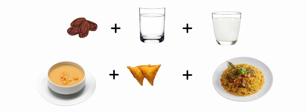 - Suhoor : repas consommé avant l’aube, déterminé par la prière du Fajr (1re prière de la journée), dernier repas avant le début du jeûne